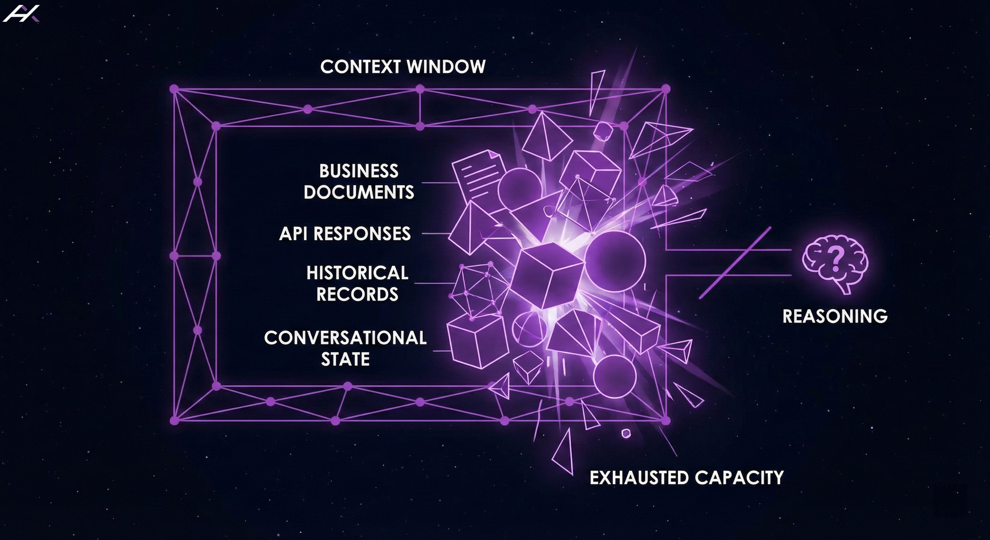 Business documents, API responses, historical records, and conversational state all compete for limited context capacity. When an agent aggregates information from multiple poorly structured systems, the context fills up before any meaningful reasoning begins.