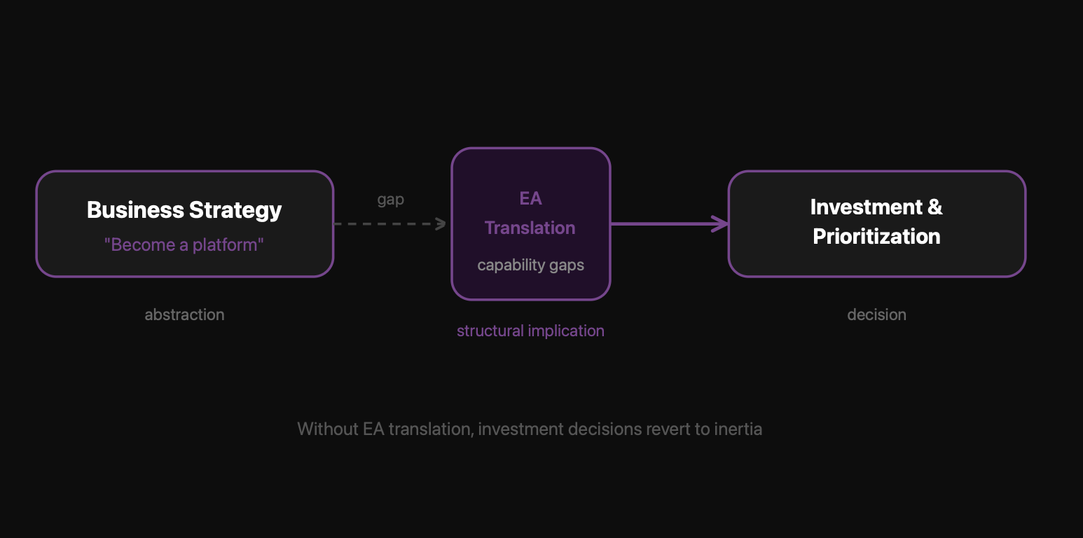 When this translation step is missing — or when EA teams produce capability maps that no one reads — the link between Business Strategy and Investment & Prioritization breaks. The consequence is not neutral. Investment decisions then revert to organizational inertia: existing budget owners defend existing systems, and the technology portfolio drifts further from strategic intent with each planning cycle. The architecture team, observing this drift, documents it. The documentation is filed. Nothing changes.