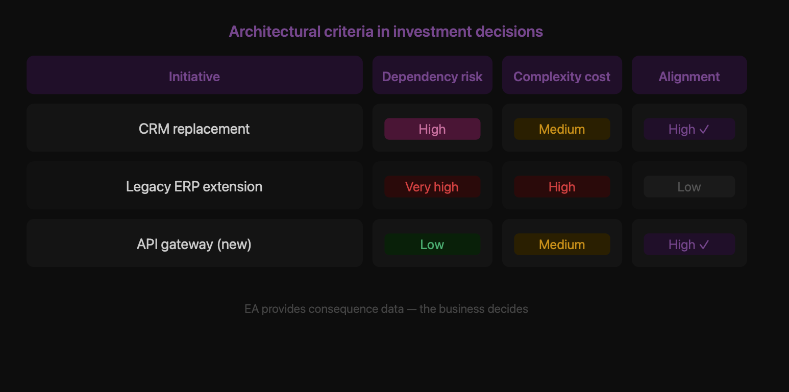 The Investment & Prioritization stage is where enterprise architecture either earns its seat at the table or loses it permanently. Portfolio decisions in large organizations are driven by a combination of regulatory pressure, business unit lobbying, vendor relationships, and whatever happens to be politically salient in the current fiscal year. Architecture can influence this process — but only if it offers something the business cannot produce on its own: a structured view of systemic risk, dependency cost, and long-term complexity accumulation.